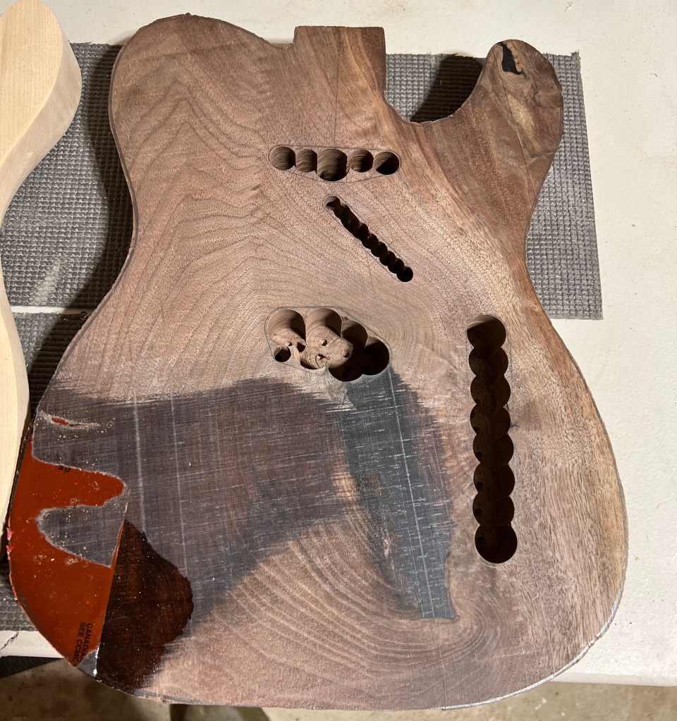 I started wanting to make guitars about five years ago, but it wasn’t until last year that I was actually asked and had enough courage to say yes. My first guitar was a walnut and epoxy telecaster for a Friend. I remember when we were going through the details I insisted he understand that this is my very first; and as much as I’ll attempt to make it as perfect as the pros in at Fenders shop, I know that is a reach!