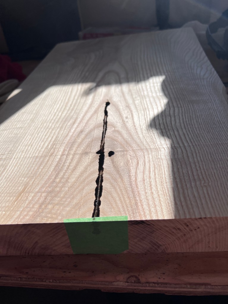 I ended up with a blank with a little epoxy wash and a nice crevice that was filled with this wonderful EcoPoxy that was tinted with some metallic blue. I chose to make the pour in the table very opaque, I remember I was looking for an area that you could see the live edge through the epoxy but still coloured. This combination turned out awesome in the end!