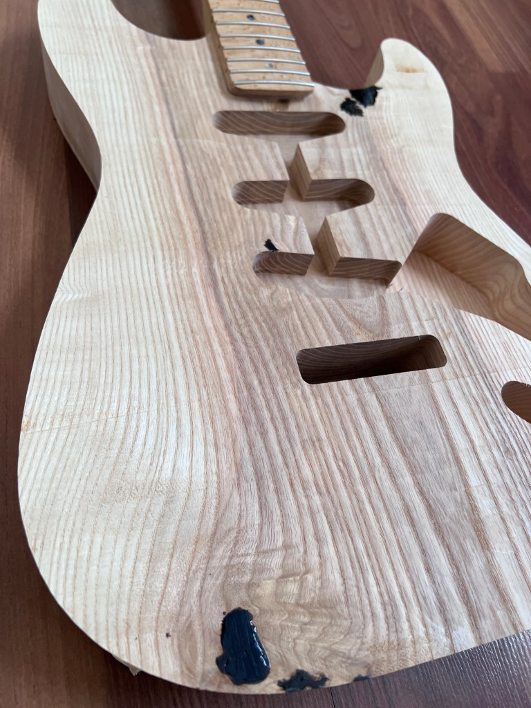 In the beginning of spring 2022 I was asked to make a custom ash Stratocaster style guitar for a friend, we are making this from scratch except the neck. This is a special piece because the tree was cut from his family’s property, I went and picked the logs up and brought them here where I milled and dried them through the summer in our kiln. Last week I designed my own idea of a strat and used my new CNC to cut it out. I nervously sat and watched the machine cut this out with my finger near the emergency stop because this blank was my only shot.